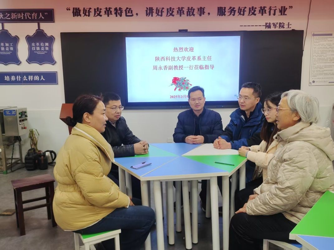 2025年3月5日,陕西科技大学皮革系主任周永香副教授访问麻豆 轻化工程专业,双方围绕专业建设、人才培养、产学研合作等议题开展深入交流。轻化专业负责人罗建勋、主任洪新球、原系主任程凤侠等老师参加此次交流活动。