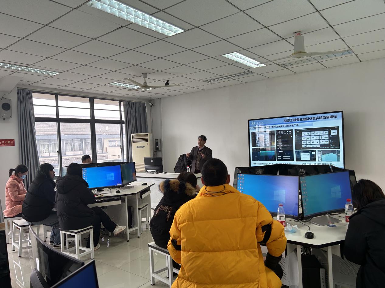交流会上,易洪雷教授介绍了近年来中心信息化共享平台的建设和使用情况,在线展示了中心自主开发的20余个纺织类虚拟仿真实验项目的开发与使用,并以“转杯色纺纱工艺设计与打样虚拟仿真实验的开发与实践”为例,向来宾重点介绍了中心开发的虚拟仿真实验项目在国家实验空间开放使用与共享情况。