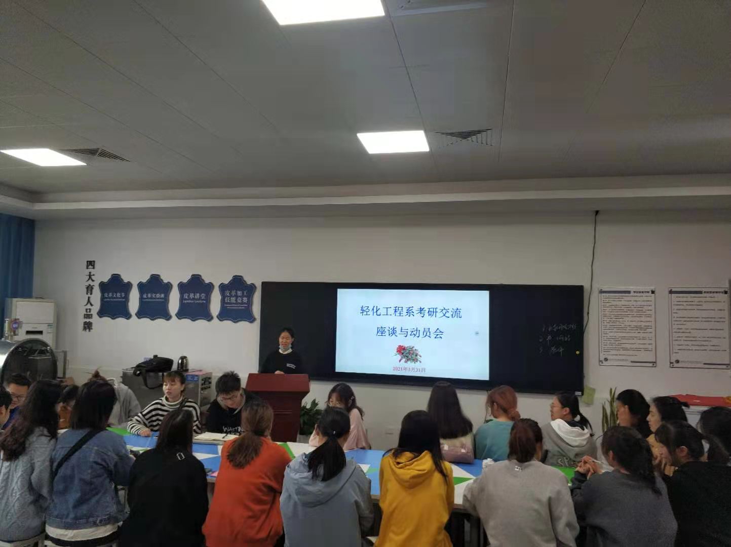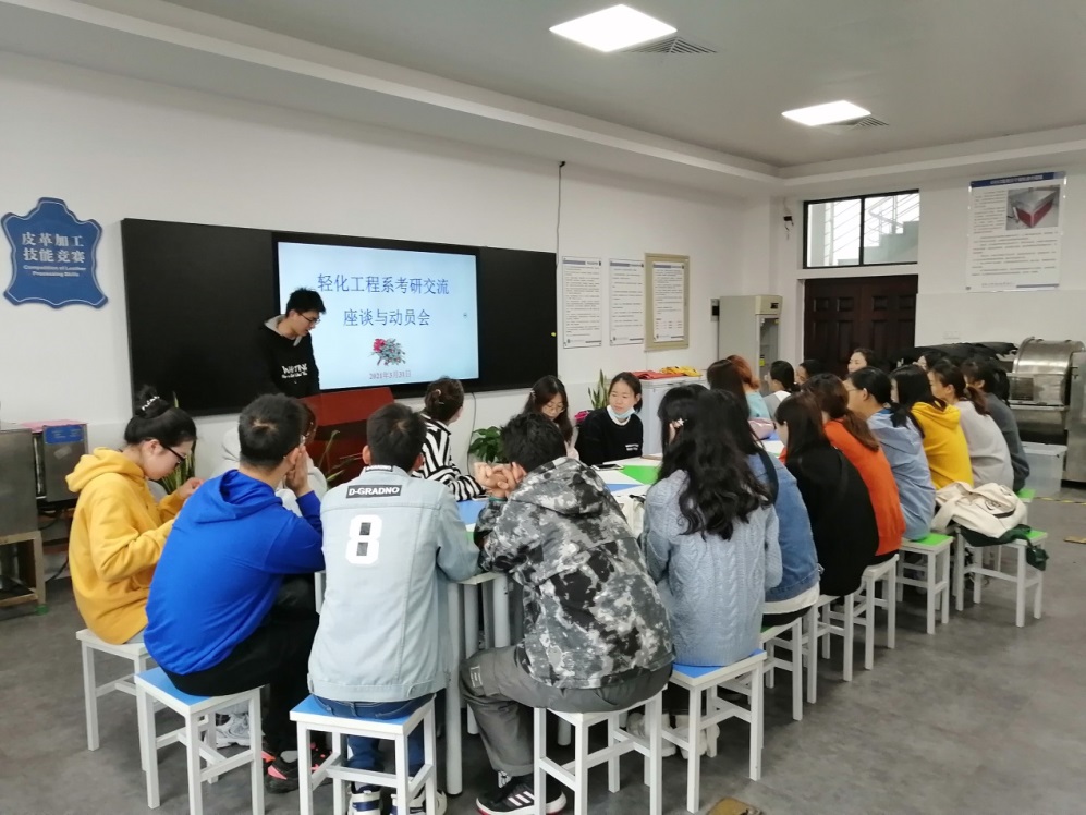 轻化工程专业学生考研热情,明确考研目标,掌握相关考研经验和技巧并了解更多考研信息,轻化工程系于3月31日上午在5号楼轻化工程智慧实验室举行了考研经验交流与动员会。轻化工程系全体教师、轻化2017级、高材2017级、纺织2017级考研成功学生、轻化2018、2019级考研学生代表参加。交流会由李书卿老师主持。