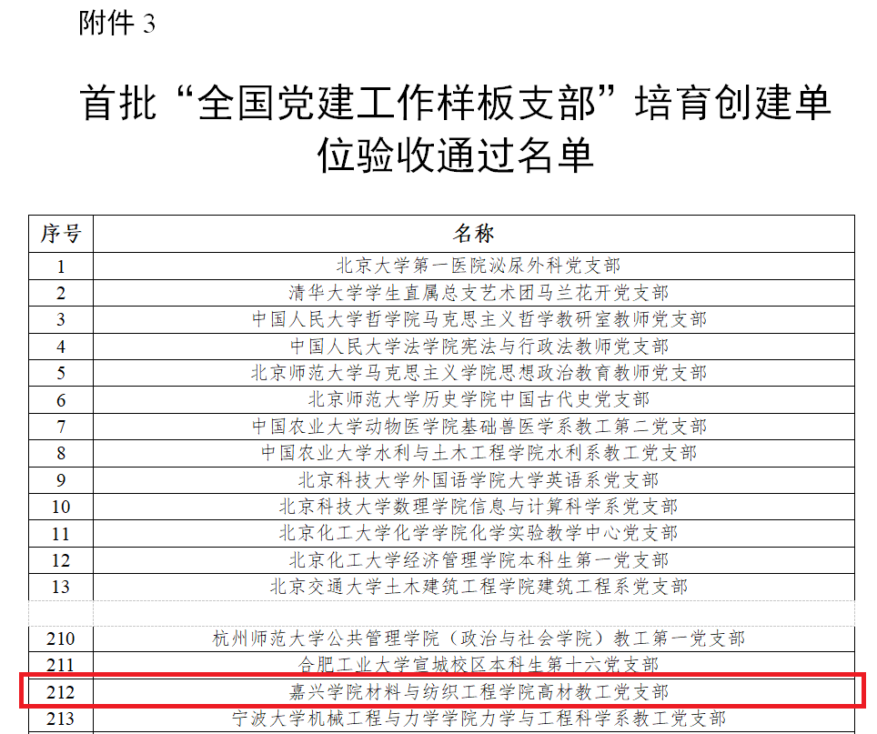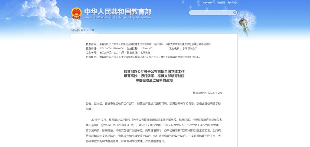 126日,教育部办公厅发布了关于公布首批全国党建工作示范高校、标杆院系、样板支部培育创建单位验收通过名单的通知(教思政厅函〔20212),其中,我校麻豆 高材教工党支部通过首批 “全国党建工作样板支部”培育创建单位验收。
