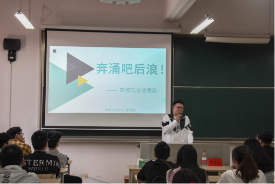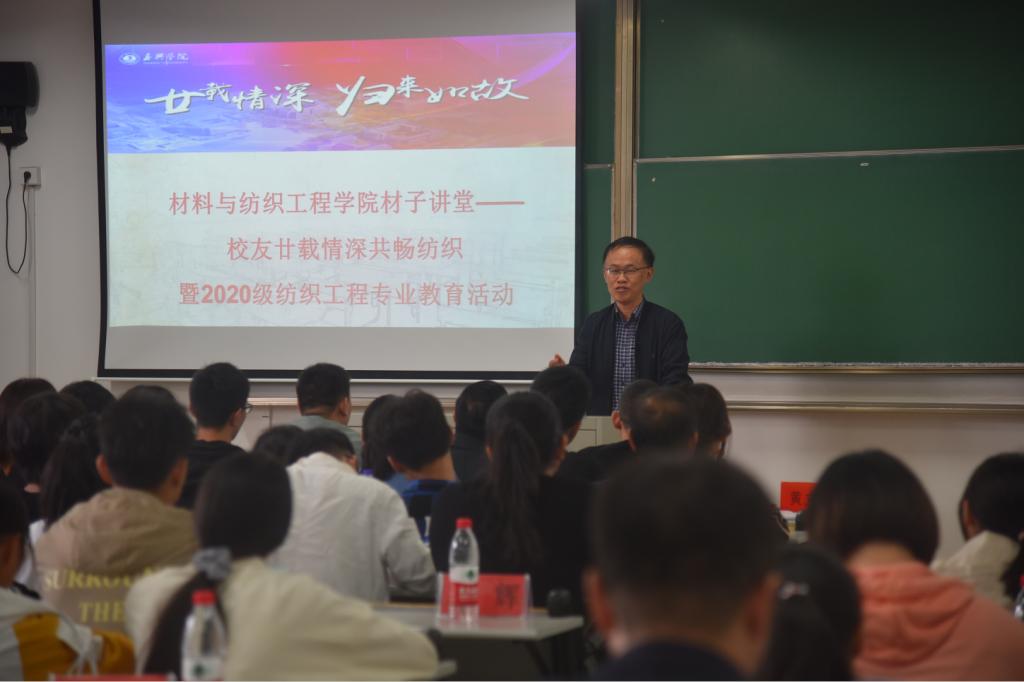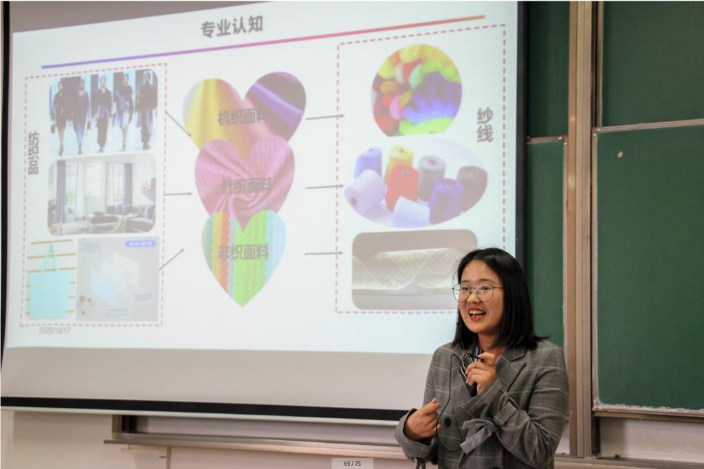 三位优秀校友向纺织系全体师生做了汇报和分享。浙江华峰氨纶集团区域经理孙剑峰、浙江新澳纺织股份有限公司染色部负责人胡李坚、东华大学在读博士孟娜分享了自己在校期间的学习经历,以及毕业后在行业内的成功经验。黄立新副院长做总结讲话,坚定了大家热爱专业,扎根行业的决心。