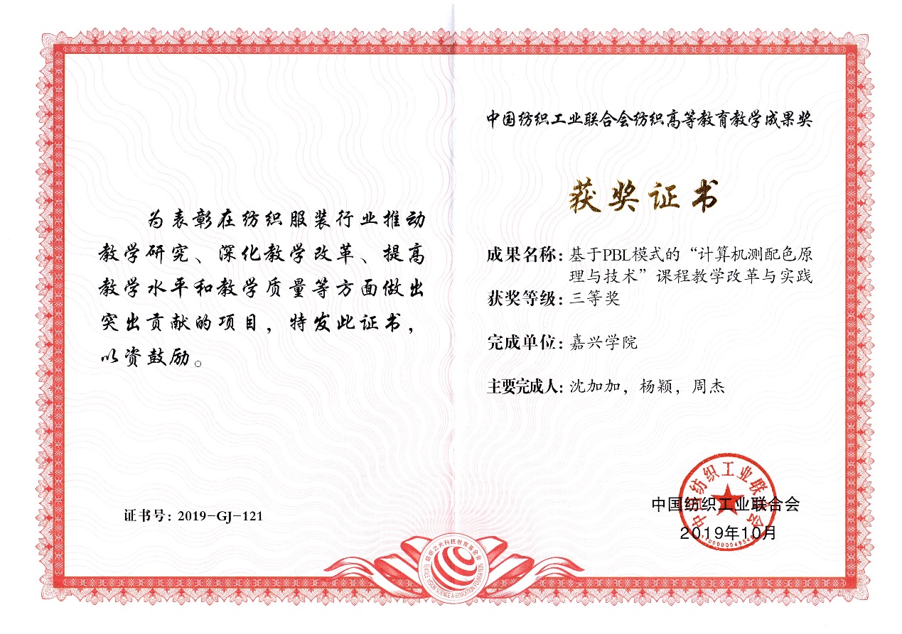 会上发布了“纺织之光” 2019年度中国纺织工业联合会高等教育教学成果奖评审结果,麻豆 纺织工程系副主任沈加加副教授主持的《基于PBL模式的“计算机测配色原理与技术”课程教学改革与实践》教学成果荣获三等奖。