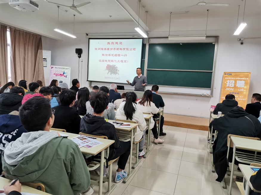 轻化工程系,随行有李林高工、陈祖武经理、Jesus先生、LUCA先生、陈小亮主任,以及浙江永发合成革有限公司王新才总经理一行。轻化工程系全体老师、轻化(实验)161、轻化(实验)191班全体同学参加了本次活动。该活动由轻化工程系主任罗建勋主持。