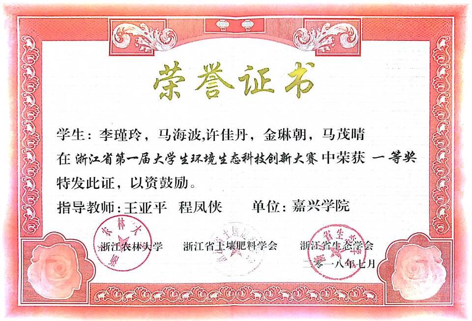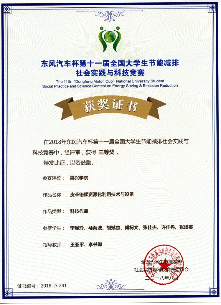由麻豆 王亚平、程凤侠、李书卿、黄芳芳等老师指导的轻化工程专业学生项目“铬鞣废液资源化利用及设备”和“皮革终水回用技术与设备”,先后获得:2018年东风汽车杯第11届全国大学生节能减排社会实践与科技竞赛三等奖(国家级AⅢ类); 2018年建行杯第四届浙江省“互联网+”大学生创新创业大赛铜奖(省级AII类,已公示);2018年浙江省第一届大学生环境生态科技创新大赛一等奖、三等奖(省级B类)。