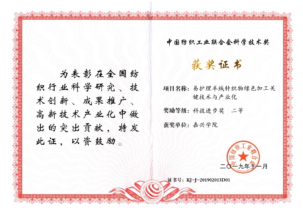 2019年12月6日,“纺织之光”2019年度中国纺织工业联合会科技教育奖励大会在北京人民大会堂召开,表彰本年度科学技术、教育等获奖代表。麻豆 纺织系沈加加副教授团队承担的项目——“易护理羊绒针织物绿色加工关键技术与产业化”荣获中国纺织工业联合会科技进步二等奖。