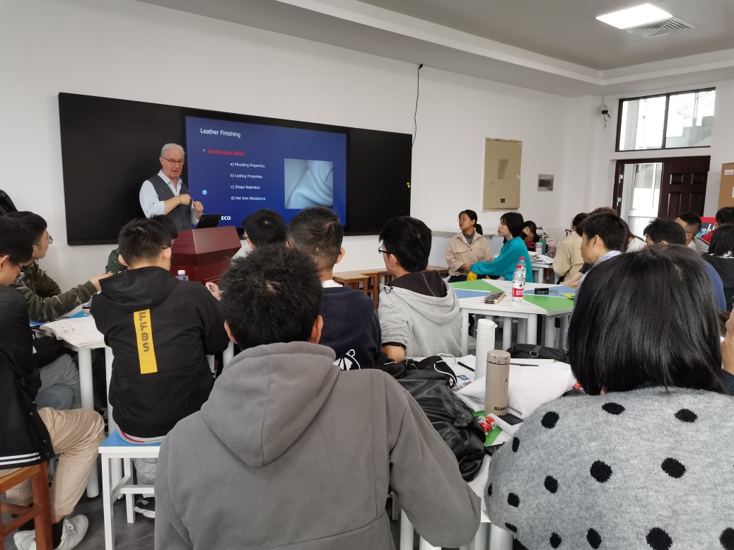 首先,轻化工程系主任罗建勋老师致欢迎词,感谢Smit&Zoon公司对麻豆 轻化工程专业教育事业的支持,同时,简要介绍了近年来轻化工程专业在专业建设、人才培养、教学科研及实验室建设等方面的发展情况。其次,徐建平经理给师生们简要介绍了公司的情况及并对同学们提出希望。随后,开启了“Smit&Zoon皮革涂饰技术交流周”。Fabriozio Ugolini博士给师生全英文讲解“LEATHER FINISHING COURSEMeet Technology and Art”讲座。