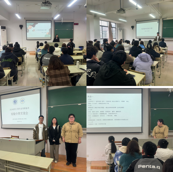 敖利民老师向同学们通报了2024年国家考研复试分数线,以及2020级考研学生过线情况。纺织204班吴安霖、王紫微同学及纺织201班劳海晴同学,分别分享了各门课程备考的时间安排、学习方法、注意事项和心得体会,并在会后与部分学弟、学妹进行了深入交流。纺织201班官文盖同学和纺织202班朱阿慧同学,利用校外实习休息时间制作了分享PPT。