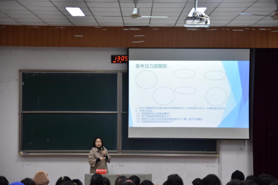 同时,为了减轻同学们在考研备考中的心理压力,促进心理健康,营造良好的学习气氛,学院邀请学校心理健康教育中心主任张玉茹老师为大家带来“材纺学子考研减压沟通会”。张老师用幽默风趣的语言带领大家重新审视自我、认识考研,通过发起“压力圆圈”、“我的花束”等心理小游戏,舒缓了考研学子紧绷的神经。她希望同学通过本次活动,放下思想包袱,注重自我心理调适,改变不合理信念,在遇到压力时,及时预约心理咨询寻求帮助。