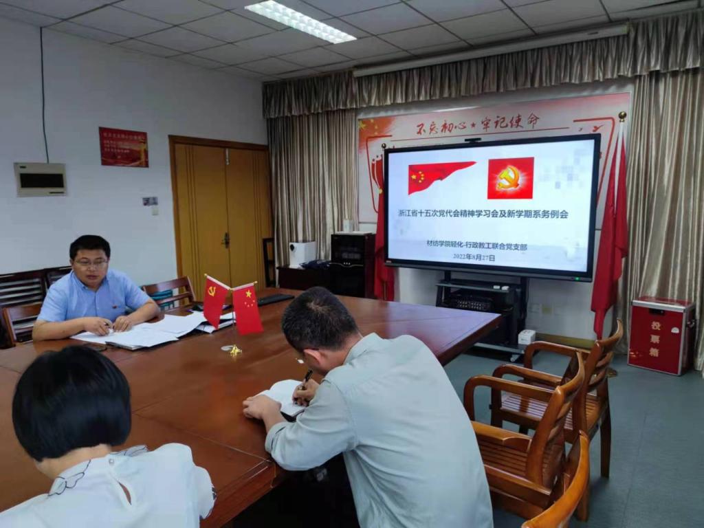 轻化-行政联合教工党支部在崇礼楼419会议室举行浙江省十五次党代会精神学习会。支部全体党员参加会议,部分非党员教工列席会议。会议由党支部书记罗建勋主持。