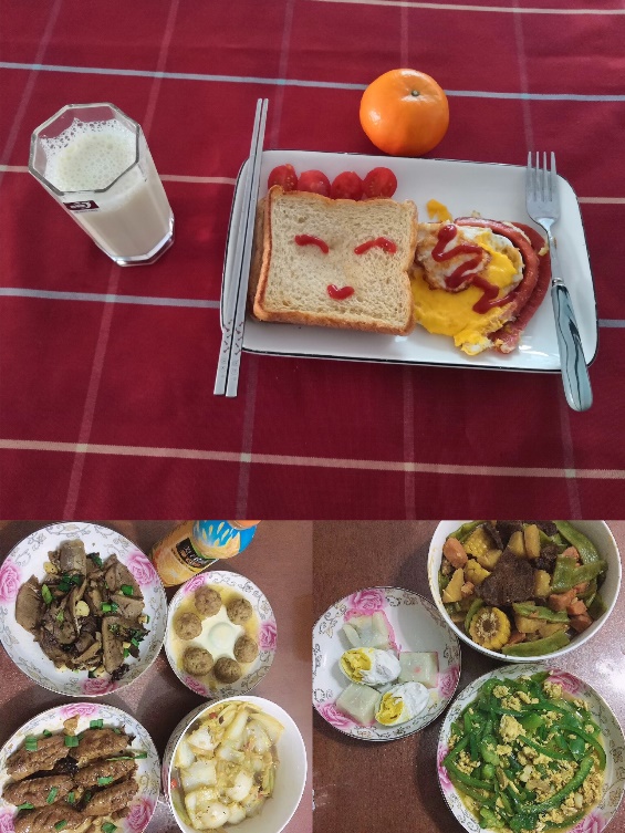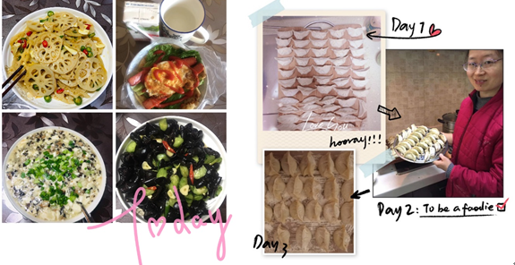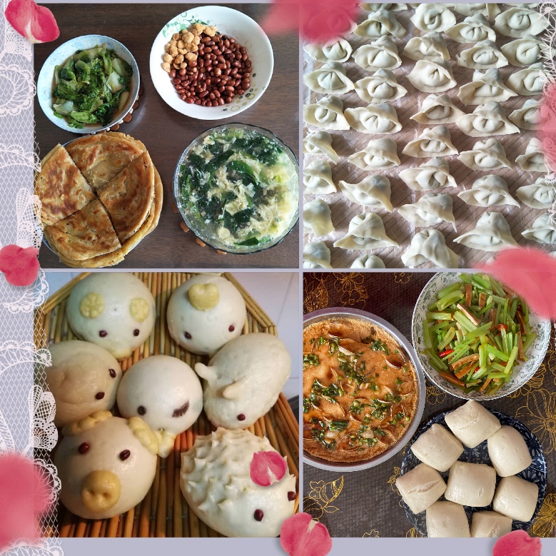 除了手工艺作品外,此次活动的一大亮点是食物的制作。中华料理源远流长,材纺学院众女神对美食的精髓把握深刻,并且在制作过程中,贯入对生活的理解和体会。陈子晗老师提供了包子和青菜肉丝拼盘。你看那封口的褶皱轮回盘转,是否特别像春天和煦的暖阳?李书卿老师在四川度过大学时代,辣子鸡里面,浸入的是天府之国的从容和豪迈。赵艳老师的面包和牛奶,一副笑脸在这样的日子里尤为可贵。陈洪旭老师东北名菜豆角土豆大乱炖和鸡翅更是最佳搭配。程凤梅老师的油饼配蛋花汤,再来一碗团团圆圆的混沌。周杰老师的猪猪包中好像还混入了一只小刺猬,这就是生活中的处处惊喜。大鱼大肉一定都吃腻了吧,吴雯老师给大家来些清淡的凉拌黄瓜木耳和藕片,一定可以调节大家油腻的味蕾。最后,不约而同的,李书卿、陈洪旭、史晶晶老师共同献上最经典的中华美食——美味的水饺。看着这些色香味俱佳的烹调作品,此刻坐在屏幕前的你,是否已经垂涎三尺?