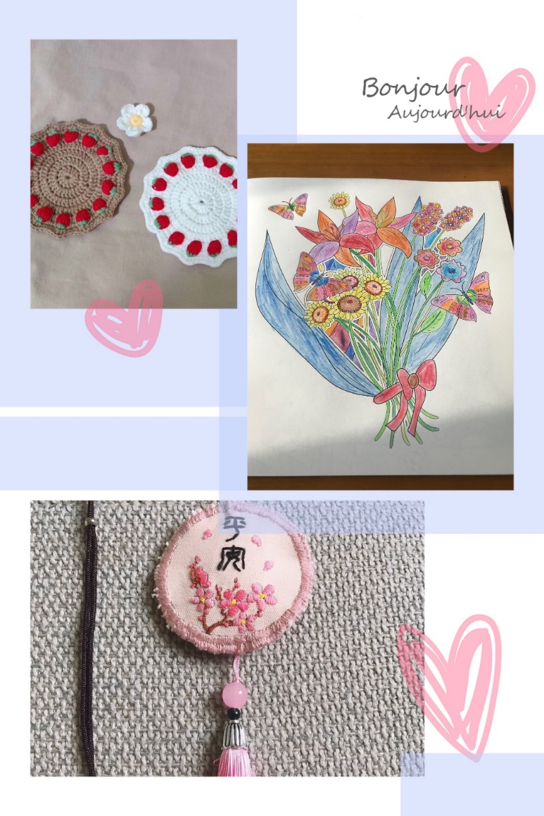 张焕侠老师发挥专业特长,巧手编制茶杯垫一套。颗颗草莓精致有序,寓意万众一红心、团结抗疫情。生俊露老师手绘“花若盛开,蝴蝶自来”图,祝福材纺众女神“大家心里都有一束花,时时盛开”。单悦老师精心编制平安结,祝愿华夏大地春暖花开,平安可待。